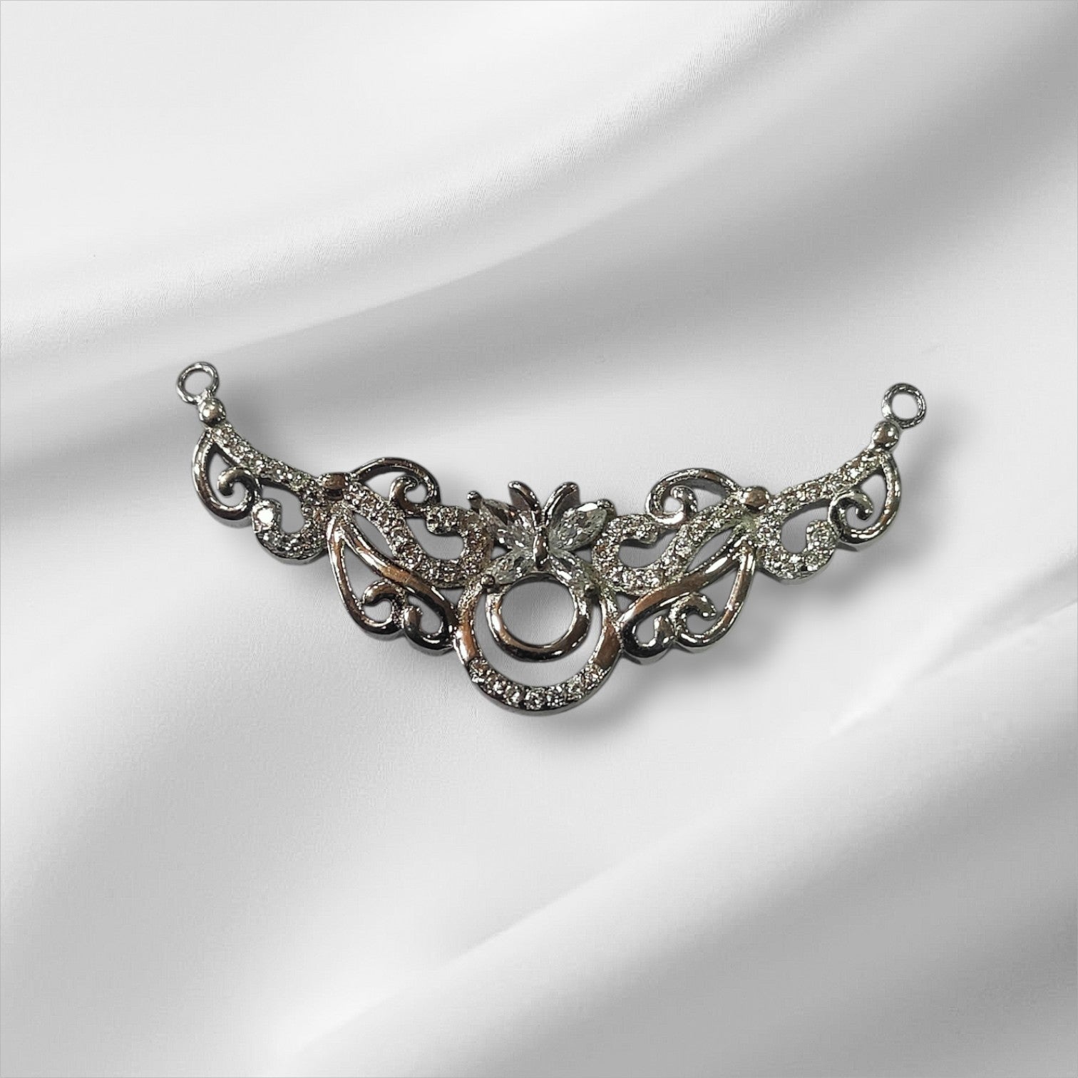 Adorn yourself with the enchanting allure of the Celestial Vine Pendant. This exquisitely detailed piece is meticulously crafted from fine silver and plated with a radiant layer of platinum, showcasing a gracefully sweeping design reminiscent of ancient celestial artistry or delicate starlit vines. Intricate swirls, accented with shimmering clear stones, flow around a central motif, making it a truly unique statement piece.